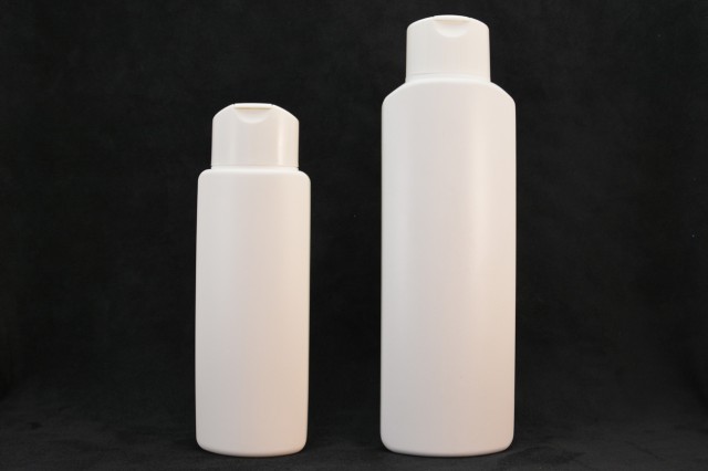 Botella ovaladas de PE blanco y tapa bisagra